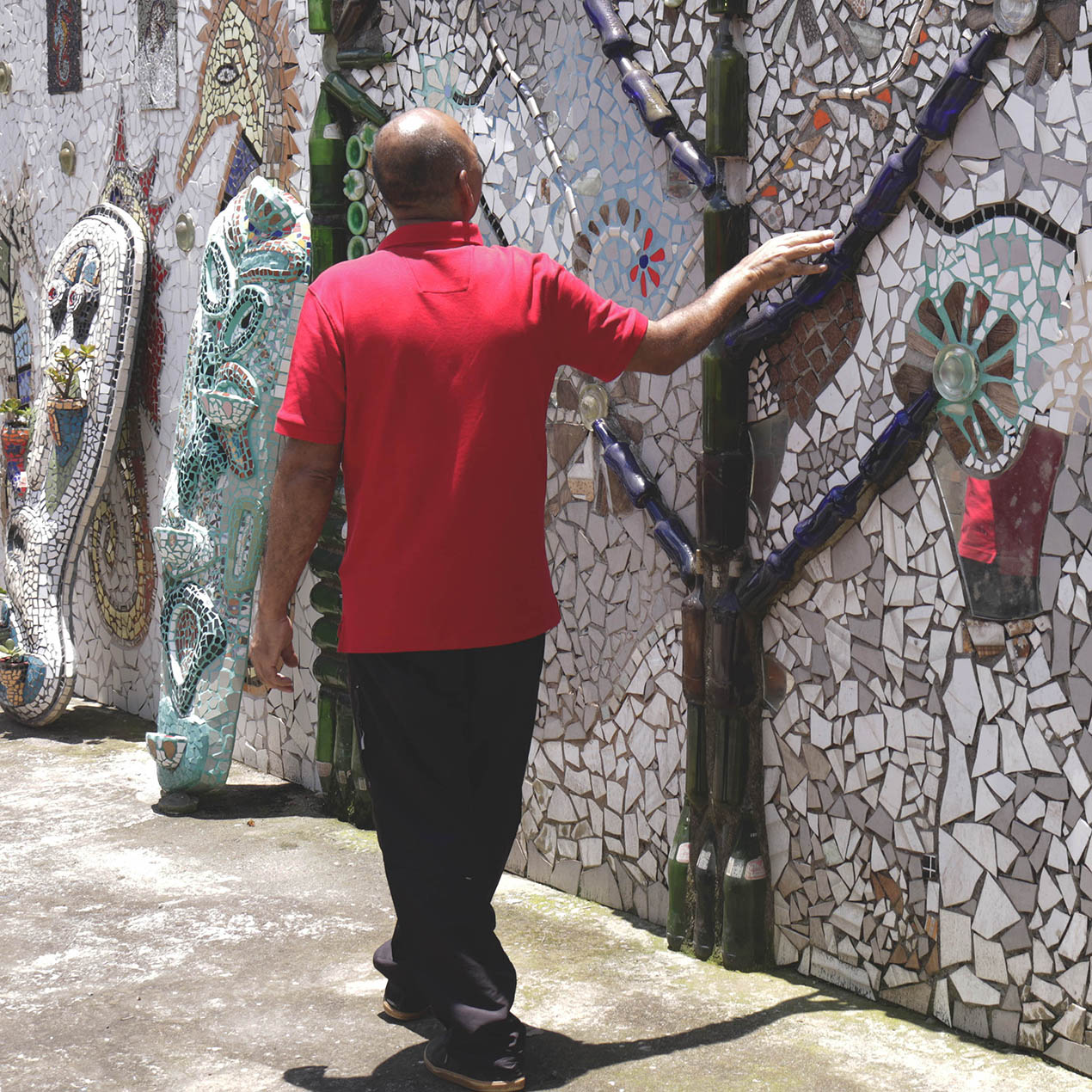 Esta escultura representa um rosto humano estilizado, com traços expressivos e formas irregulares. Feita com pedaços de cerâmica e vidro coloridos, a peça tem olhos bem abertos, um nariz alongado e uma boca tensa, que transmite uma sensação de preocupação. Um detalhe especial são os pequenos vasos embutidos na estrutura, onde crescem plantas naturais.