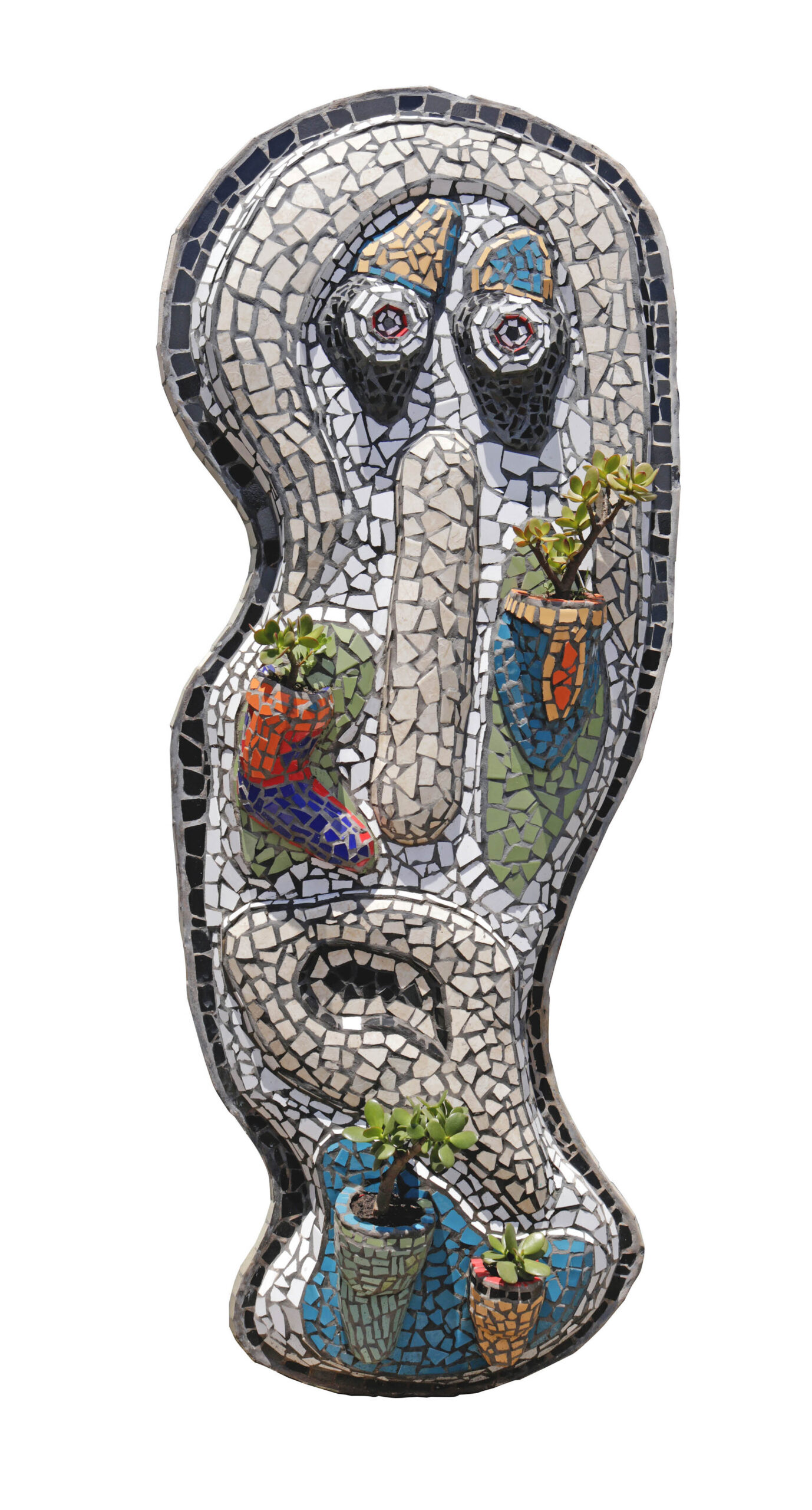 Esta escultura representa um rosto humano estilizado, com traços expressivos e formas irregulares. Feita com pedaços de cerâmica e vidro coloridos, a peça tem olhos bem abertos, um nariz alongado e uma boca tensa, que transmite uma sensação de preocupação. Um detalhe especial são os pequenos vasos embutidos na estrutura, onde crescem plantas naturais.