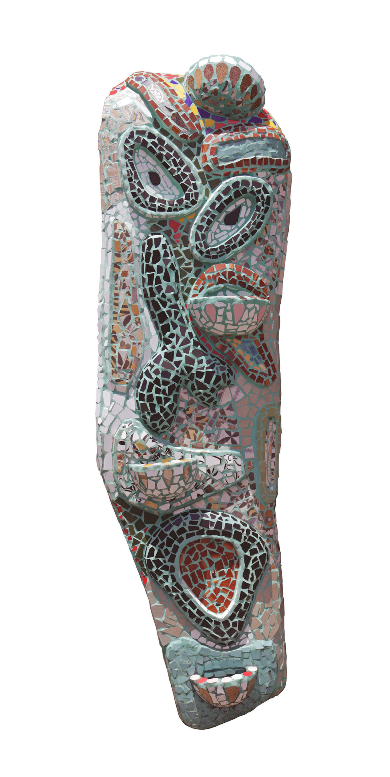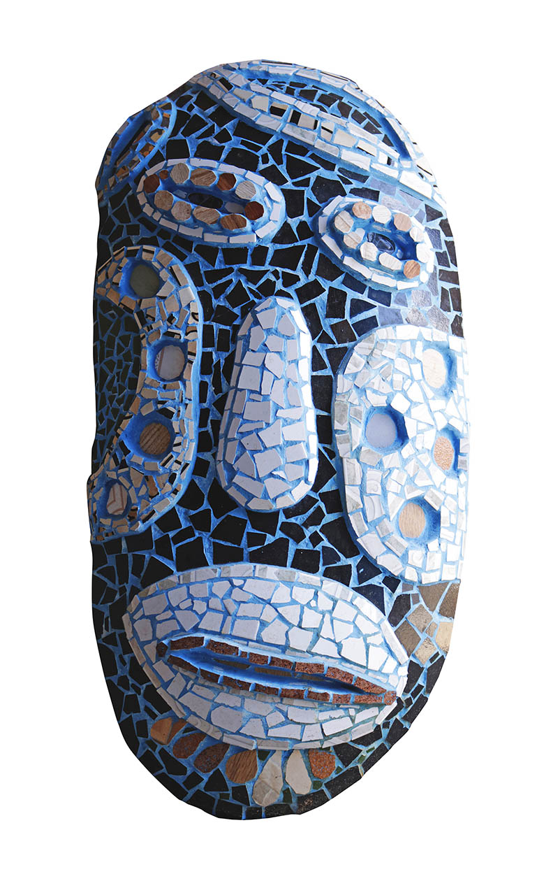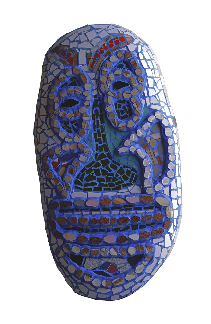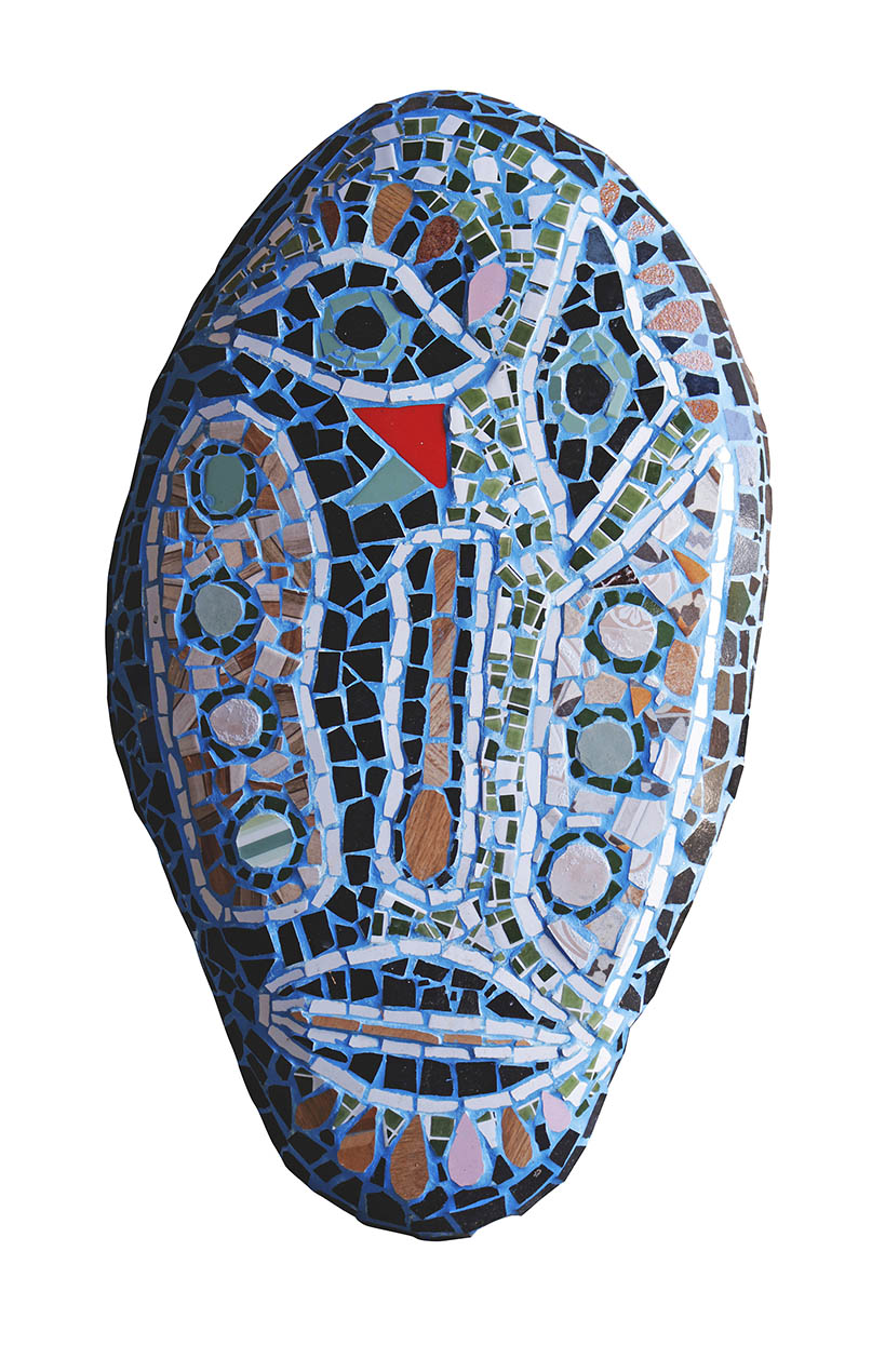 Parecida com máscaras rituais de diferentes culturas, essa escultura tem um formato oval e detalhes que lembram rostos tradicionais. O mosaico combina tons de azul, verde, terrosos e vermelho vibrante. Os olhos têm formas diferentes: um mais horizontal e outro mais vertical. Acima do olho esquerdo, pequenas peças formam cílios, e abaixo dele, uma peça vermelha em forma de lágrima parece escorrer pelo rosto.