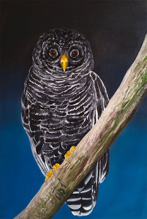 A imagem mostra uma pintura realista de uma coruja-preta pousada em um galho. A ave está de frente, com o corpo voltado ligeiramente para a direita. Seu olhar é direto e penetrante, com grandes olhos redondos e escuros. O bico curto e curvado é amarelo vivo, assim como as garras que se prendem ao galho.