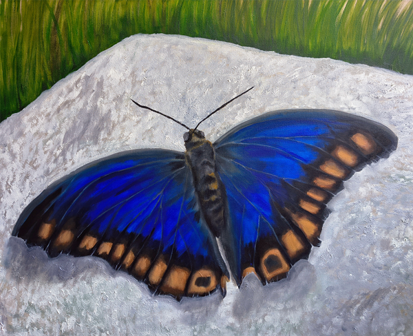 A pintura retrata uma borboleta-prepona-azul pousada sobre uma pedra clara. Suas asas abertas exibem um azul intenso e brilhante, com bordas pretas decoradas por manchas em tons de marrom e laranja. O corpo é estreito, de coloração escura, com linhas discretas em tom marrom-amarelado. A pedra, em tons de cinza e branco, possui textura rugosa e ocupa grande parte da cena. Ao fundo, aparece uma faixa de vegetação verde desfocada, que representa a grama, reforçando a ideia de ambiente natural. O contraste entre o azul vibrante das asas e o fundo neutro da pedra faz da borboleta o centro da composição, transmitindo delicadeza e beleza.