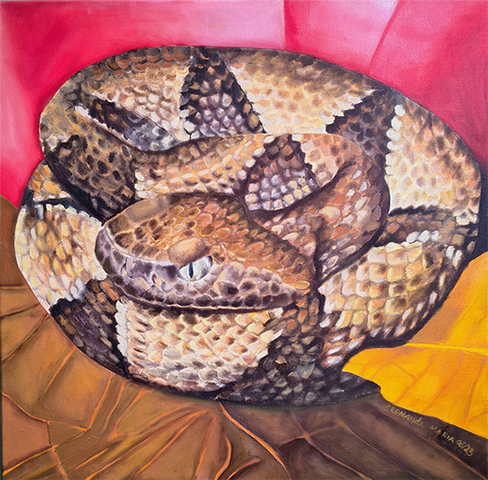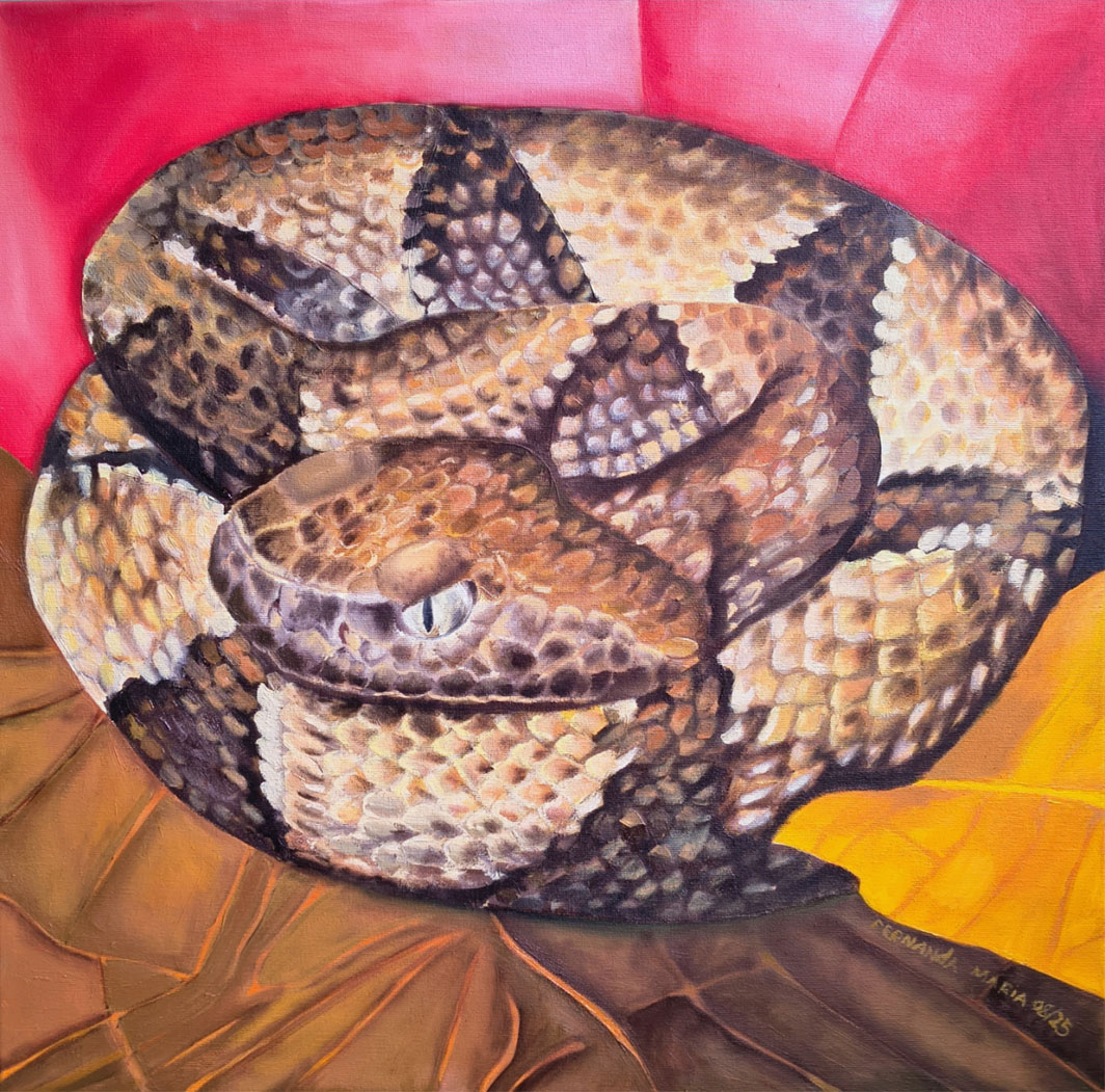 A pintura retrata uma jararaca-de-murici em posição de descanso, com o corpo enrolado em espirais compactas. A serpente apresenta coloração em tons de marrom, bege e dourado, formando padrões geométricos de manchas triangulares e escamas bem marcadas. Sua cabeça está voltada para frente, em destaque, com olhos claros e pupilas verticais que transmitem alerta e intensidade. A cobra ocupa quase todo o quadro, repousando em folhagem seca em tons de marrom, amarelo e vermelho vibrante. A obra transmite tanto o realismo da pele escamosa quanto um caráter artístico pelas escolhas de cor e composição.