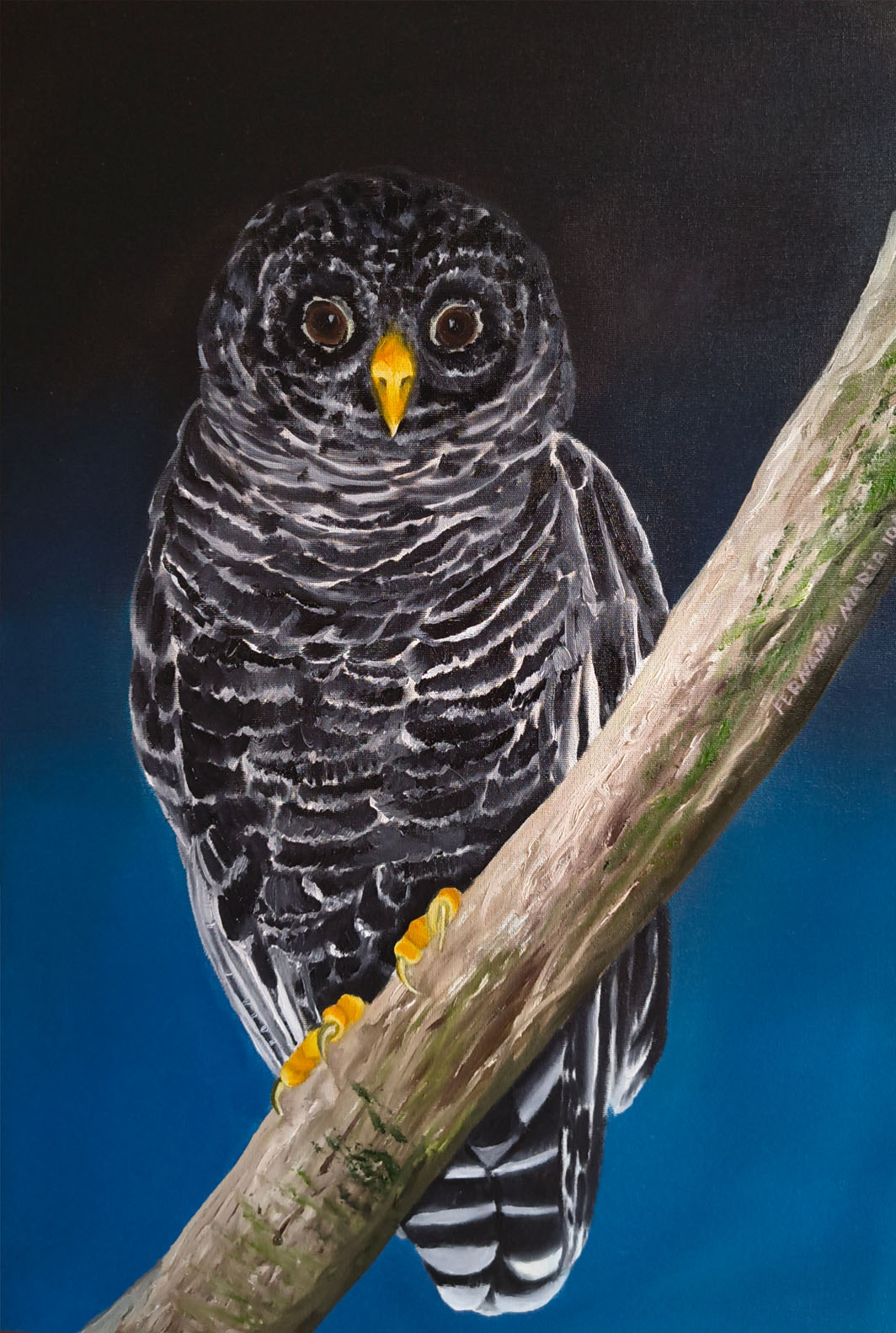 As penas da coruja são em tons de preto e cinza, formando faixas horizontais finas e regulares por todo o corpo. O fundo da pintura tem um degradê que vai do azul intenso, na parte inferior, ao preto, na parte superior, destacando a ave no centro da composição.