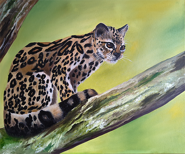 posição de atenção, com o olhar fixo e penetrante. Sua pelagem é dourada, coberta por manchas pretas arredondadas e alongadas que se distribuem por todo o corpo e pela cauda espessa, também marcada por anéis escuros. As orelhas são pequenas e pontiagudas, voltadas para frente. O fundo da pintura é composto por um degradê de tons verdes e amarelos, sugerindo a mata ao entardecer, sem outros elementos em