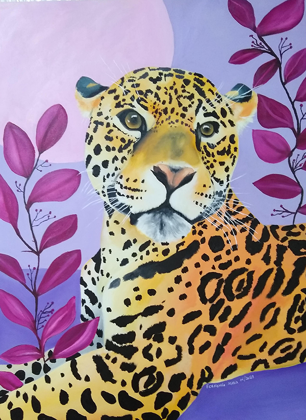 comum entre os felinos. Sua pelagem é amarela e alaranjada, coberta por manchas pretas características da espécie. O fundo é lilás, com um grande círculo em tom rosa-claro no canto superior esquerdo. Dos dois lados da onça surgem galhos com