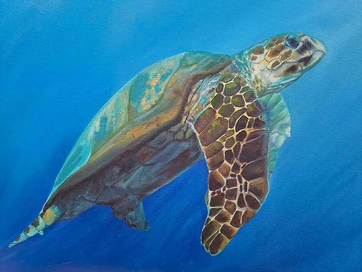A imagem é uma pintura realista que retrata uma tartaruga-de-pente nadando em um fundo azul intenso, que representa o mar. A tartaruga está posicionada de perfil, na diagonal, voltada para a direita. Sua carapaça é alongada e apresenta tons esverdeados e amarronzados, com áreas iluminadas em amarelo e azul. A nadadeira dianteira mais próxima do observador está estendida e ocupa grande parte da imagem; ela tem manchas geométricas em tons de marrom e dourado, lembrando o padrão de um casco. A cabeça da tartaruga aparece voltada para cima, com expressão serena, e exibe detalhes em marrom, bege e verde. O fundo azul liso, sem outros elementos, reforça a sensação de profundidade e tranquilidade do ambiente subaquático.