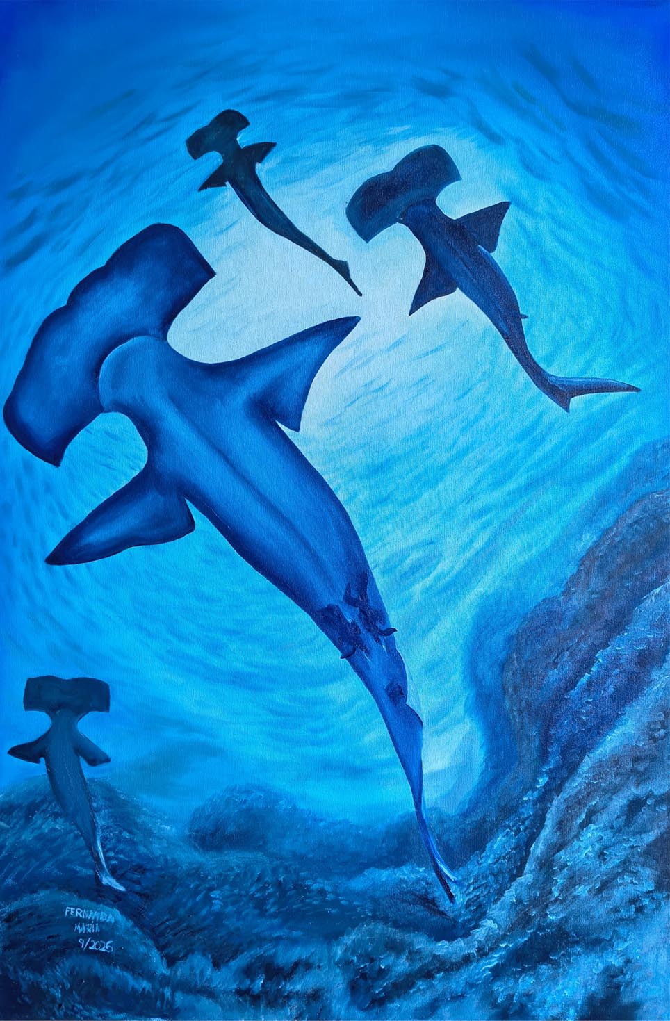 A pintura retrata um grupo de quatro tubarões martelo-panã nadando em direção à superfície do mar. A perspectiva da pintura é subaquática, o que dá a impressão de que os animais estão nadando acima do espectador. No centro há um grande tubarão martelo-panã, e os outros três aparecem nadando ao fundo. O ventre dos animais é azul mais claro, o que os ajuda a se misturar na paisagem. há também ondulações na água, o que transmite uma sensação de serenidade. o fundo do mar é rochoso e tem tons de azul mais escuro, preto e cinza, o que contrasta com o degradê que vai do branco ao azul na superfície.